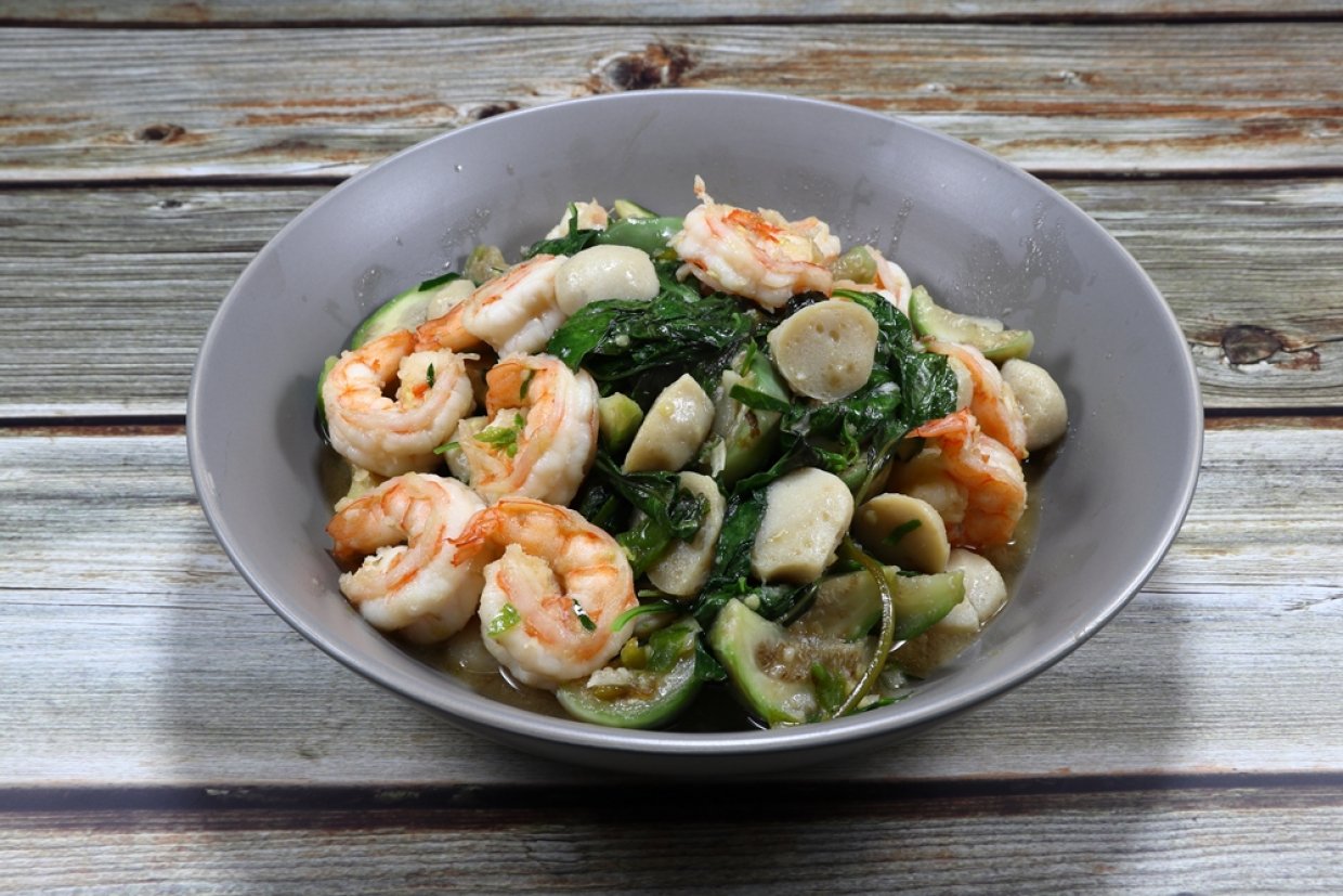 - Грибы (маринованные) – 200 г * Цукини – 1 штука * Креветки (очищенные) – 250 г * Шпинат замороженный – 80 г