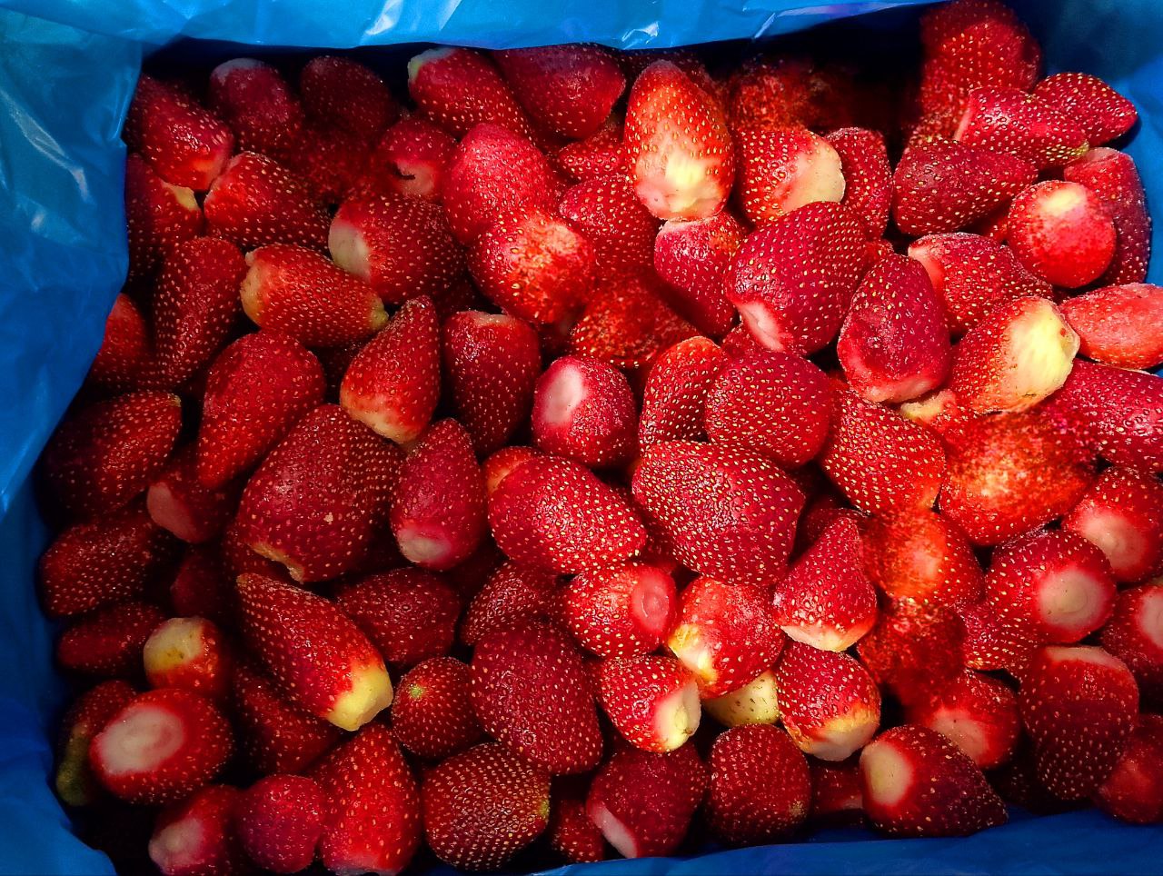 - Клубнику нарежьте пополам или на четвертинки.