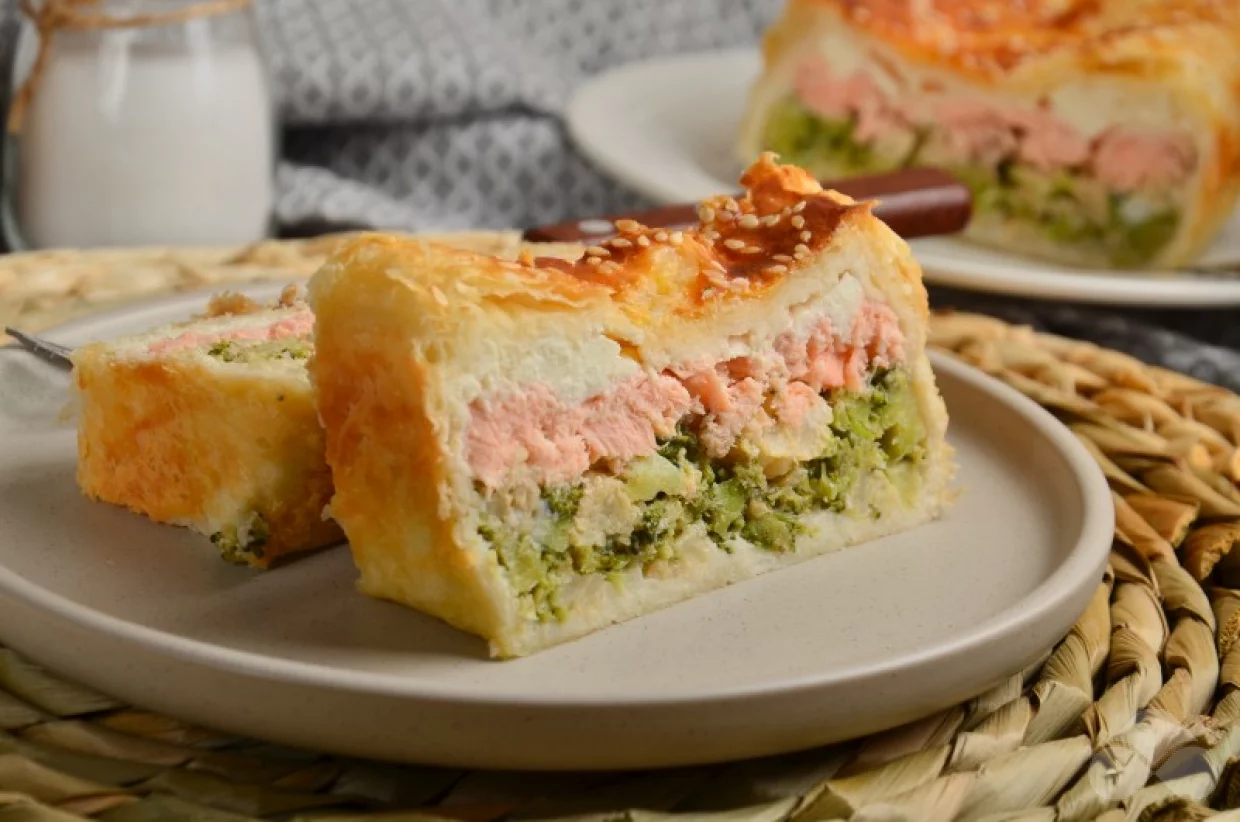 7.Запекайте 20 минут в духовке при 180 градусах под фольгой, а затем 10 минут без фольги. Дайте чуть остыть, нарежьте на кусочки и подавайте пирог на стол.