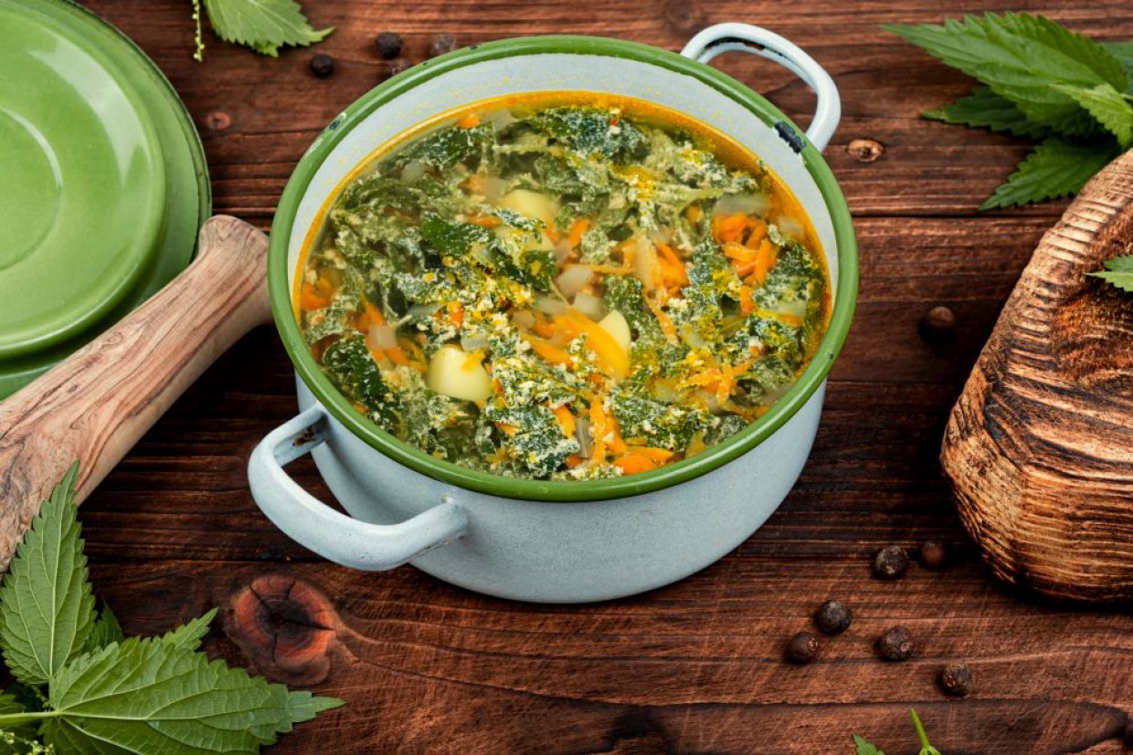 7.Влейте яичную заготовку в кипящий суп, добавьте крапиву и соль, проварите еще 3 минуты.