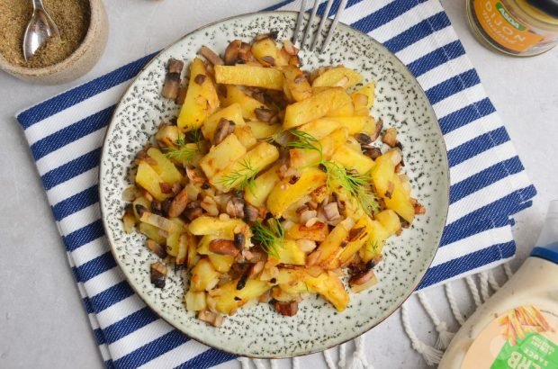 Ингредиенты: Картофель – 600 г * Грибы замороженные – 150 г * Лук репчатый – 1 штука Растительное масло (для жарки) – 1 ст.л. * Соль – по вкусу * Специи и приправы – по вкусу Пошаговый рецепт приготовления: 1.Картофель почистите, помойте и нарежьте произвольно, небольшими кусочками. Для равномерной прожарки кусочки должны быть одинакового размера. 2.Помойте грибы и почистите лук, все нарежьте. Если грибы замороженные, лучше их обжарить отдельно и добавить…
